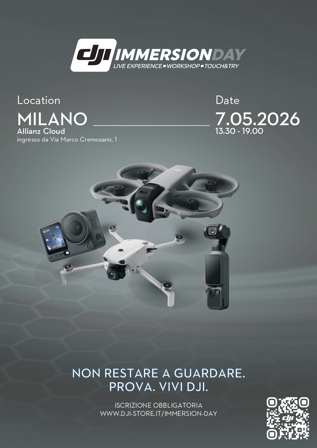 Il DJI Immersion Day è aperto a tutti, l’accesso è gratuito con registrazione obbligatoria: www.dji-store.it/immersion-day/ . Allianz Cloud – ingresso da Via Marco Cremosano, 1 – Milano | giovedì, 7 maggio 2026 | dalle 13:30 alle 19:00