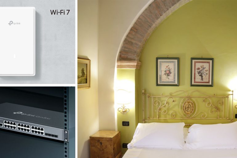 Al fine di rispondere alle esigenze di copertura uniforme e amministrazione della rete, all’interno dell’Albergo delle Drapperie è stata installata un’architettura in grado di garantire stabilità, flessibilità e semplicità di controllo. Il progetto ha previsto l’utilizzo di tecnologie Omada SDN capaci di sfruttare appieno la connettività in fibra a 2,5 Gbps, eliminando i punti critici che in passato penalizzavano la qualità del servizio. La nuova architettura è stata concepita per sostenere un’elevata densità di dispositivi e ampiezza di banda, assicurando continuità di navigazione e prestazioni costanti in ogni ambiente della struttura. Il progetto ha previsto il posizionamento di dieci Access Point Wi-Fi 7 EAP773, selezionati per il loro design ultra sottile e la compatibilità con la rete Wi-Fi 7 Tri-Band, e di un Access Point Wi-Fi 7 EAP725-Wall caratterizzato dal suo look discreto necessario in contesti di pregio dove tecnologia e raffinatezza devono inserirsi senza alterare l’eleganza degli ambienti storici. La struttura è stata completata con l’integrazione di uno Switch Managed L2+ SG3428X-M2 con 24 porte 2,5 Gbps e 4 porte 10 Gbps per una connessione ad alta capacità. Tutti i componenti sono gestiti con l’Omada Software Controller, una piattaforma in cloud con interfaccia user-friendly e sistemi di monitoraggio e gestione in real-time utili a prevenire immediatamente possibili criticità di rete.